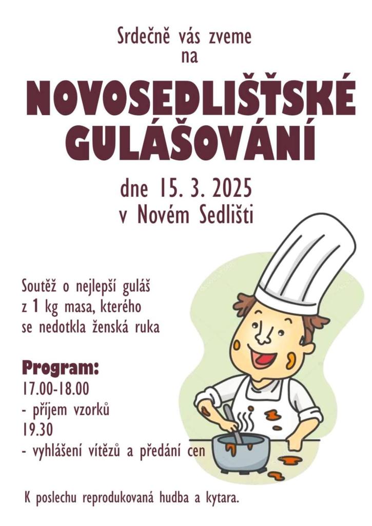 SDH Nové Sedliště Vás zve na soutěž o nejlepší guláš z 1 kg masa, kterého se nedotkla ženská ruka, která se koná 15. 3. 2025 od 17.00 hodin.
