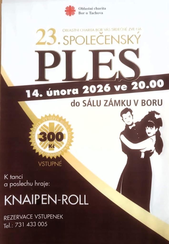 Oblastní charita Bor u Tachova Vás srdečně zve v sobotu 14. února na 23. Společenský ples do sálu zámku v Boru. Vstupné: 300 Kč
