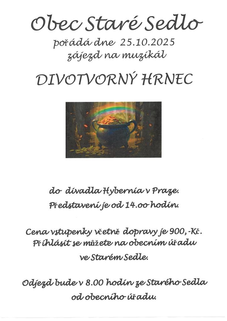 Obec Staré Sedlo pořádá zájezd na muzikál Divotvorný hrnec do divadla Hybernia v Praze.